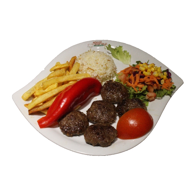 Akçaabat Köfte, Izgara Biber, Izgara Domates, Patates Cips, Salata, Pilav ve Makarna ile servis edilir.
