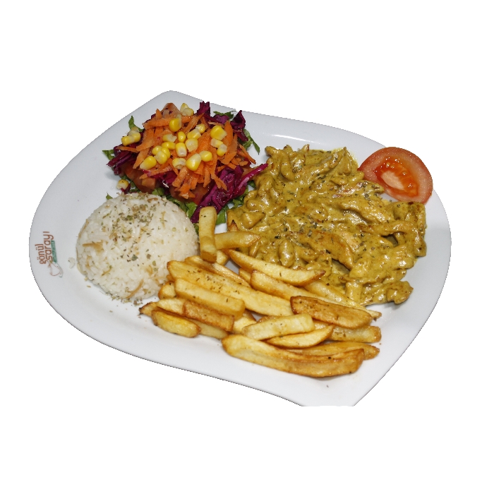 Jülyen Göğüs Tavuk, Salata, Pilav, Patates Cips, Özel Krema ve Köri sosu ile servis edilir.