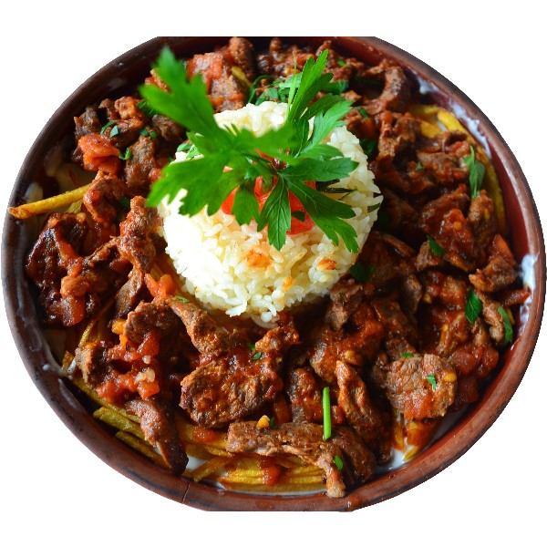 Küp Et ( İç Bonfile ), Kapya Biber, Yeşil Biber, Soğan, Mantar, Soya Sosu, Patates Cips, Pilav ve Özel Baharat Sos ile servis edilir.