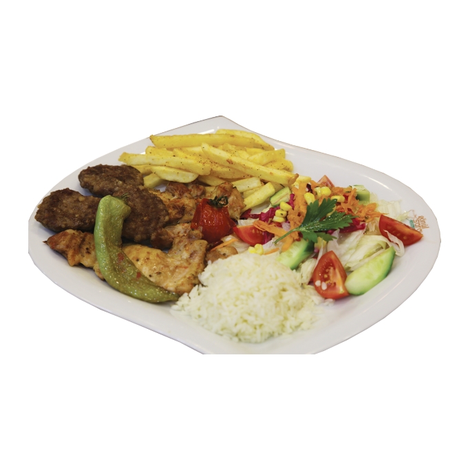 Akçaabat Köfte, Tavuk Pirzola, Izgara Biber, Izgara Domates, Patates Cips, Pilav ve Makarna ile servis edilir.